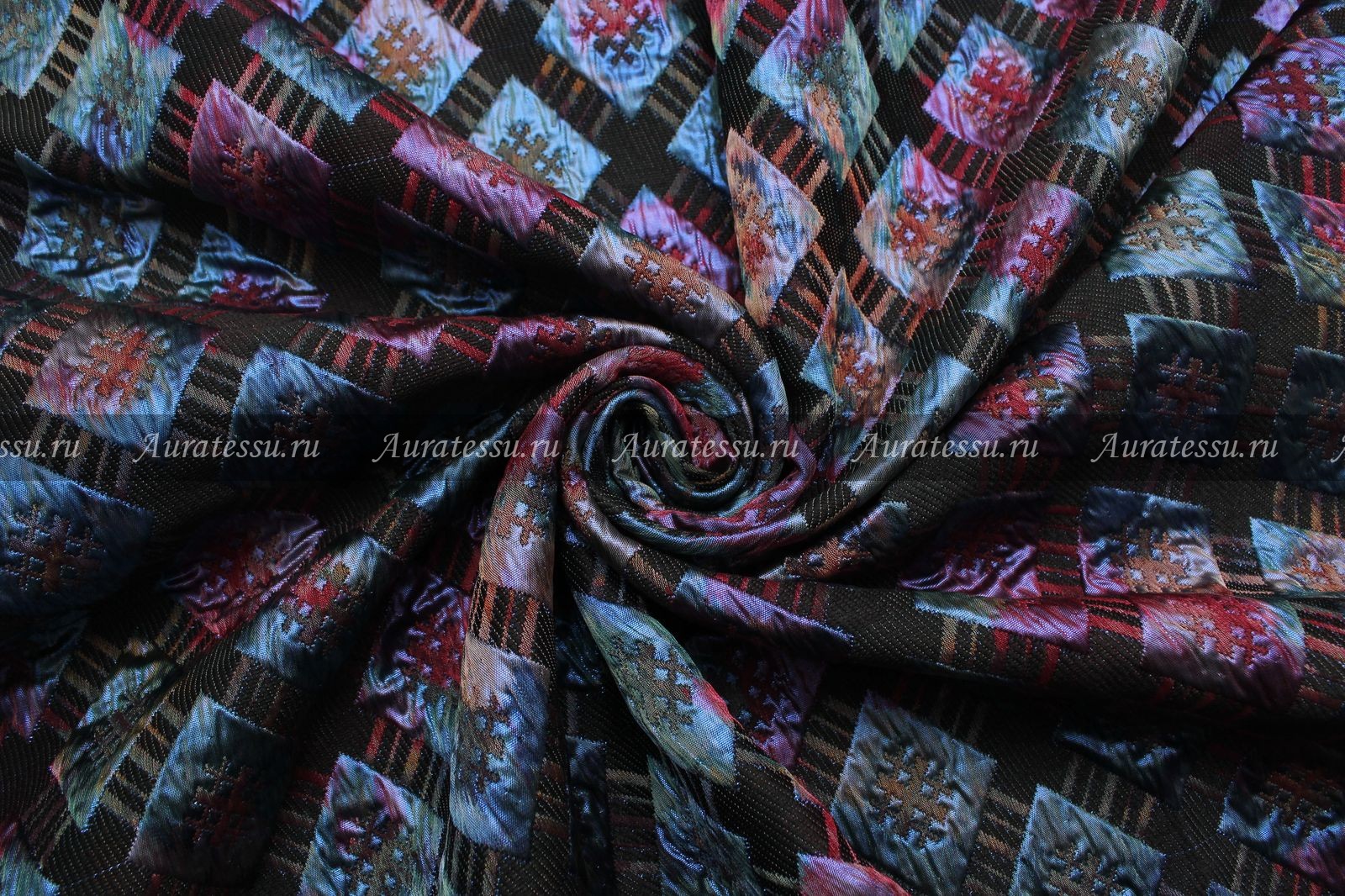 Дополнительная информация:Плотное двухслойное жаккардовое полотно (клоке) с узором ромбов по лицевой стороне ткани. На чёрном матовом фоне геометрический узор ромбов 5x5 см соединенных между собой пятью диагональными полосами различной толщины. Цветовая гамма в синих, пурпурных, вишнёвых, оливковых оттенках. Ткань с лёгким перламутровым глянцем ромбовидного рисунка. Полотно упругое, держит форму. Подходит для пошива летней пальтовой и курточной одежды, жакетов, юбок классических силуэтов. Рекомендации по уходуЖаккардовые ткани с составом 100% полиамид: 100% полиамид или полиамид с эластаном (в том числе полиамид более 50%+ ацетат): плательная, костюмная группа. Ткани жаккардовых переплетений, в состав которых входит в основном полиамид с добавлением вискозы, ацетата и эластана можно стирать в машине при температуре до 30°С в щадящем режиме. Можно отжимать в барабане, но всегда лучше на оборотах до 500. Синтетические ткани практически не дают усадку и не мнутся. Для сушки их нужно подвешивать лучше наизнанку. Эти ткани сохнут быстро и иногда не нуждаются в утюжке. Если вы хотите их отутюжить, то делайте это с изнаночной стороны с паром. Гладить на "шелке", можно слегка сбрызнуть. Жаккарды, с шёлковыми волокнами: Рекомендации производителя - профессиональная химчистка. При таком составе, мы тоже не рекомендуем стирать ткань, но вы можете попробовать на кусочке, оставшемся от кроя: ручная стирка, вода до 30°С, не замачивать, мягкие моющие средства для шёлка, стирать только загрязненные места, отжим в полотенце, сушка в горизонтальном расправленном виде изнанкой вверх, гладить на шелке. Вкусочек побольше, чтобы было видно, как поведёт себя ткань.