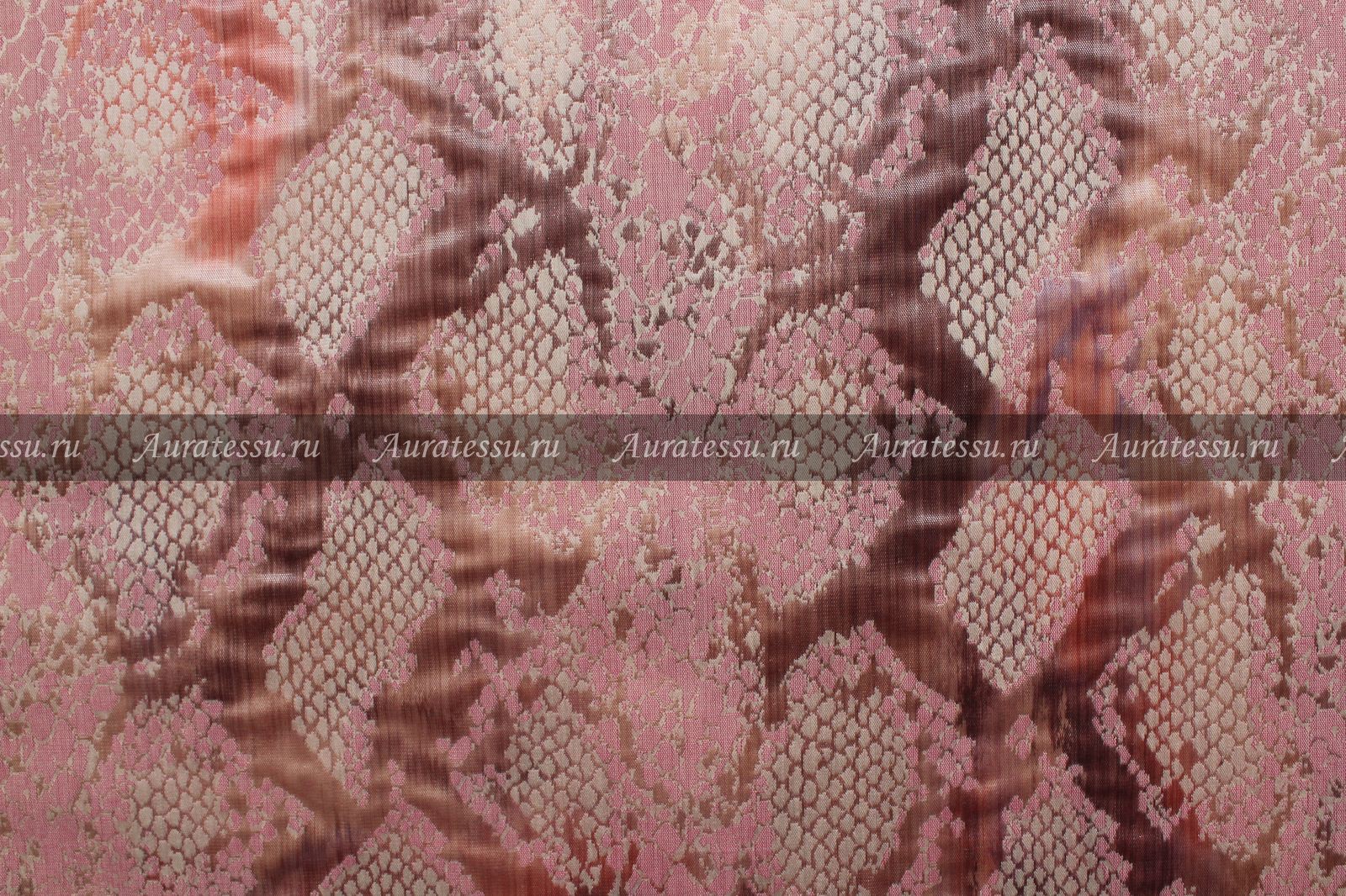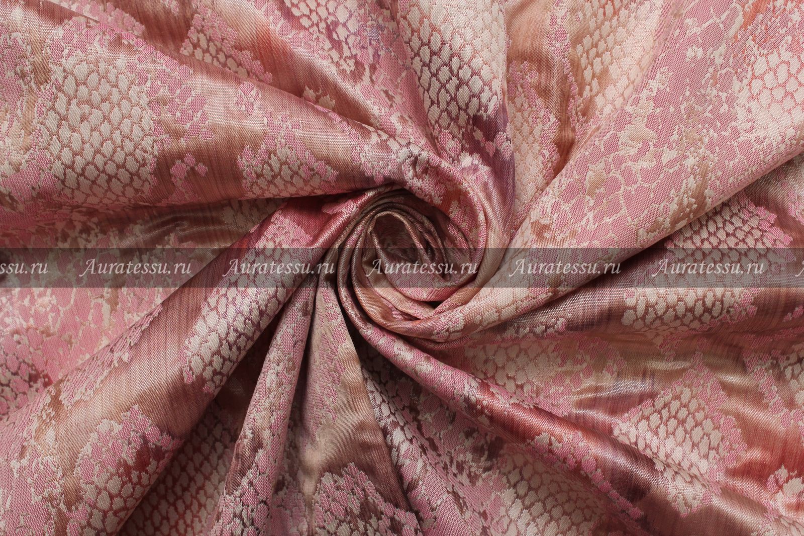 Мягкий и пластичный двухслойный жаккард, тонкий, но плотно сотканный, в розовом и бежевом (глянцевом) цвете с рисунком под рептилию. Полотно выполнено в технике клоке, отлично держит форму, красиво лежит в складках и фалдах. Подходит для пошива летних пальто, жакетов, прямых и пышных юбок.