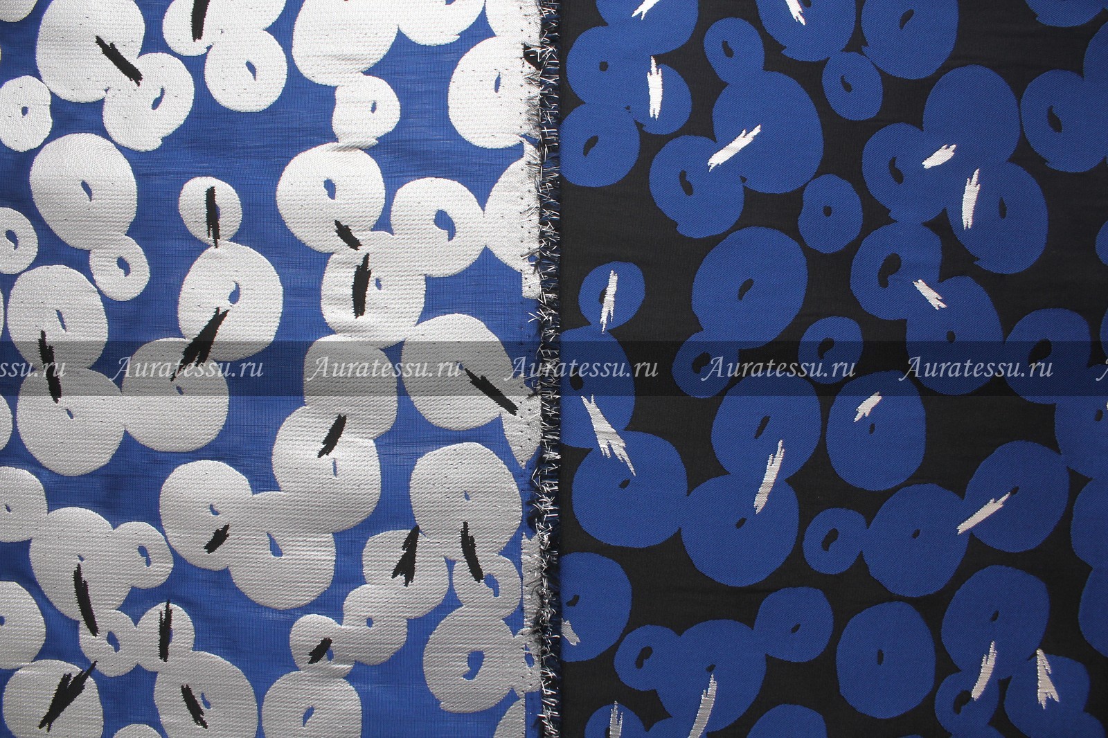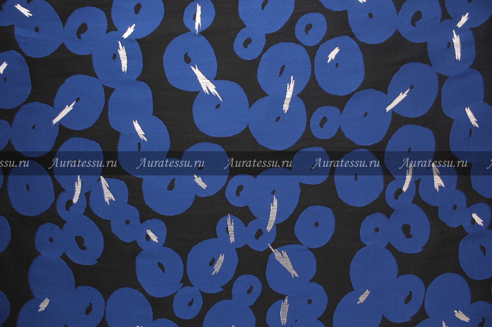 Дополнительная информация:Средней плотности жаккардовое полотно по свойствам напоминающее плотную тафту. Ткань чёрного цвета с рисунком в ярко-синий, неправильной формы горох. Круглые фигурки накладываются друг на друга, имеют разный диаметр, по центру чёрный мазок. По всему полю ткани серебристые, слегка блестящие штрихи, разной направленности. Полотно отлично запоминает и держит форму. Подходит для костюмных и плательных изделий прямых и объёмных силуэтов. Рекомендации по уходуЖаккардовые ткани с составом 100% полиамид: 100% полиамид или полиамид с эластаном (в том числе полиамид более 50%+ ацетат): плательная, костюмная группа. Ткани жаккардовых переплетений, в состав которых входит в основном полиамид с добавлением вискозы, ацетата и эластана можно стирать в машине при температуре до 30°С в щадящем режиме. Можно отжимать в барабане, но всегда лучше на оборотах до 500. Синтетические ткани практически не дают усадку и не мнутся. Для сушки их нужно подвешивать лучше наизнанку. Эти ткани сохнут быстро и иногда не нуждаются в утюжке. Если вы хотите их отутюжить, то делайте это с изнаночной стороны с паром. Гладить на "шелке", можно слегка сбрызнуть. Жаккарды, с шёлковыми волокнами: Рекомендации производителя - профессиональная химчистка. При таком составе, мы тоже не рекомендуем стирать ткань, но вы можете попробовать на кусочке, оставшемся от кроя: ручная стирка, вода до 30°С, не замачивать, мягкие моющие средства для шёлка, стирать только загрязненные места, отжим в полотенце, сушка в горизонтальном расправленном виде изнанкой вверх, гладить на шелке. Вкусочек побольше, чтобы было видно, как поведёт себя ткань.