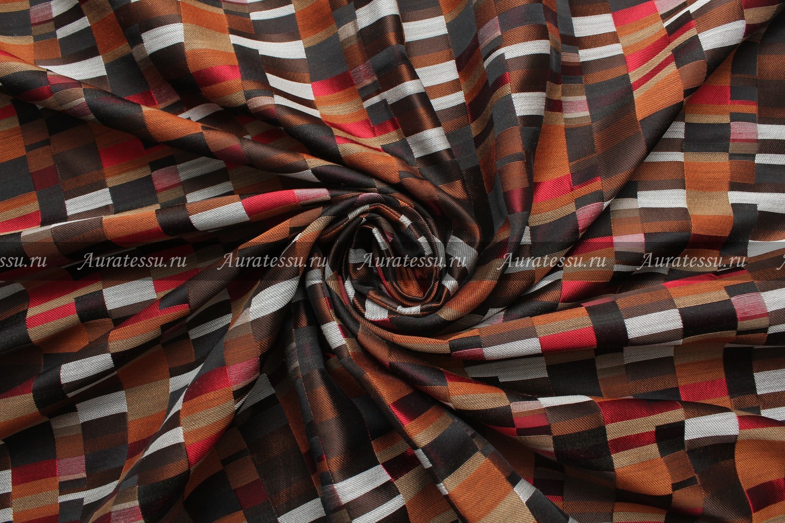 Дополнительная информация:Плотная 330 г/мп, двухсторонняя жаккардовая тафта с рисунком в клетку. Цветовая гамма в коричневато-рыжих, бронзовых, бордовых тонах. Нити матовые в сочетание с глянцевыми оттенками. Изнаночной стороны у ткани нет, обе стороны лицевые. Узор в виде продольных полос разделенных на прямоугольники фрагменты. Полотно упругое, держит форму. Подходит для пошива костюмной и плательной одежды прямых, объёмных силуэтов. Рекомендации по уходуЖаккардовые ткани с составом 100% полиамид: 100% полиамид или полиамид с эластаном (в том числе полиамид более 50%+ ацетат): плательная, костюмная группа. Ткани жаккардовых переплетений, в состав которых входит в основном полиамид с добавлением вискозы, ацетата и эластана можно стирать в машине при температуре до 30°С в щадящем режиме. Можно отжимать в барабане, но всегда лучше на оборотах до 500. Синтетические ткани практически не дают усадку и не мнутся. Для сушки их нужно подвешивать лучше наизнанку. Эти ткани сохнут быстро и иногда не нуждаются в утюжке. Если вы хотите их отутюжить, то делайте это с изнаночной стороны с паром. Гладить на "шелке", можно слегка сбрызнуть. Жаккарды, с шёлковыми волокнами: Рекомендации производителя - профессиональная химчистка. При таком составе, мы тоже не рекомендуем стирать ткань, но вы можете попробовать на кусочке, оставшемся от кроя: ручная стирка, вода до 30°С, не замачивать, мягкие моющие средства для шёлка, стирать только загрязненные места, отжим в полотенце, сушка в горизонтальном расправленном виде изнанкой вверх, гладить на шелке. Вкусочек побольше, чтобы было видно, как поведёт себя ткань.