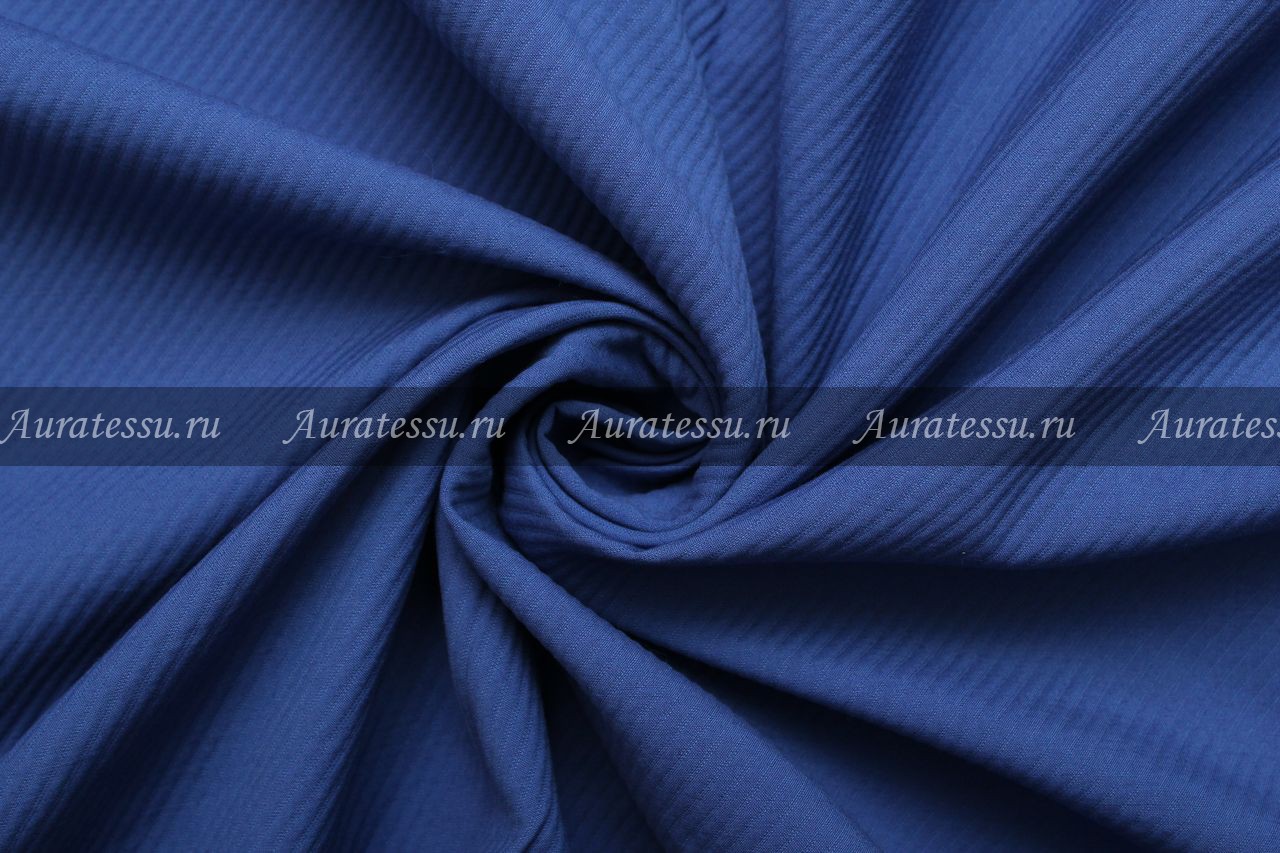 Жаккардовая плотно сотканная ткань с рисунком в виде выпуклой диагональной полоски шириной около 2 мм. Цвет ткани сине-васильковый. Полотно упругое, отлично держит форму. Подходит для пошива костюмно-плательной одежды строгих форм и линий.