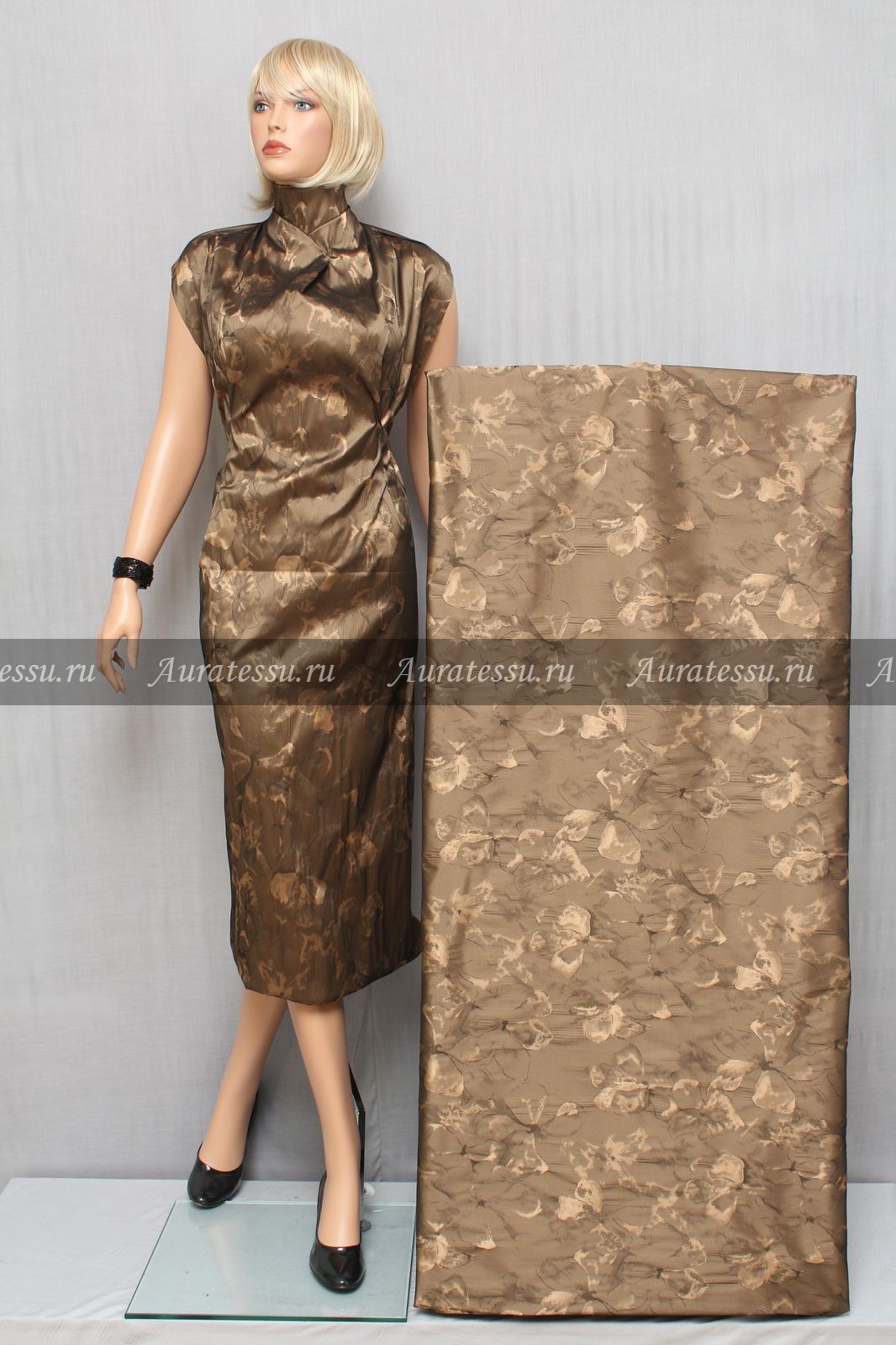 Дополнительная информация:Достаточно тонкое жаккардовое полотно коричневато-табачного цвета с чёрными прожилками узора. Ткань эластичная по нити основы (тянется вдоль полотна). Рисунок силуэтно-цветочный с тонированными фрагментами на тон светлее. Так же по полю ткани встречается небольшой креш по теме рисунка. Полотно пластичное, мало мнущееся. Подходит для пошива плательной и костюмной одежды разнообразных моделей и силуэтов. Рекомендации по уходуЖаккардовые ткани с составом 100% полиамид: 100% полиамид или полиамид с эластаном (в том числе полиамид более 50%+ ацетат): плательная, костюмная группа. Ткани жаккардовых переплетений, в состав которых входит в основном полиамид с добавлением вискозы, ацетата и эластана можно стирать в машине при температуре до 30°С в щадящем режиме. Можно отжимать в барабане, но всегда лучше на оборотах до 500. Синтетические ткани практически не дают усадку и не мнутся. Для сушки их нужно подвешивать лучше наизнанку. Эти ткани сохнут быстро и иногда не нуждаются в утюжке. Если вы хотите их отутюжить, то делайте это с изнаночной стороны с паром. Гладить на "шелке", можно слегка сбрызнуть. Жаккарды, с шёлковыми волокнами: Рекомендации производителя - профессиональная химчистка. При таком составе, мы тоже не рекомендуем стирать ткань, но вы можете попробовать на кусочке, оставшемся от кроя: ручная стирка, вода до 30°С, не замачивать, мягкие моющие средства для шёлка, стирать только загрязненные места, отжим в полотенце, сушка в горизонтальном расправленном виде изнанкой вверх, гладить на шелке. Вкусочек побольше, чтобы было видно, как поведёт себя ткань.