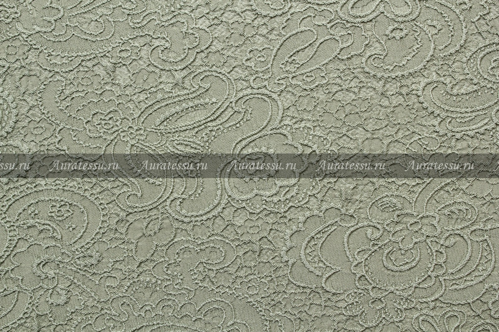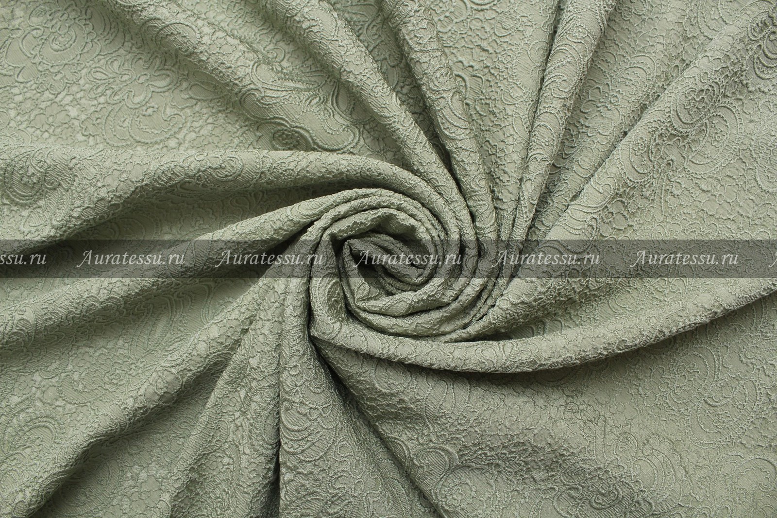 Средней плотности жаккардовое полотно нефритового цвета. Рисунок  витиеватый, вензельный, выпуклый. Узор густой и слегка глянцевый на матовом фоне. Полотно слегка эластичное, держит форму. Подходит для пошива плательной, костюмной одежды разнообразных силуэтов.