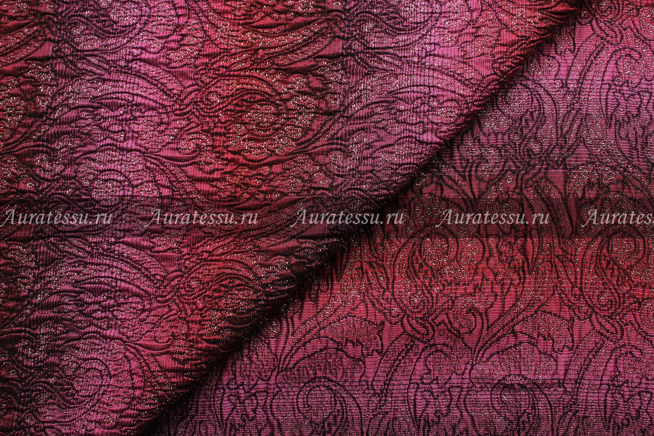 Дополнительная информация:Чёрно-пурпурный перламутровый жаккард с ненавязчивой серебристой люрексовой нитью, выполнен в технике "клоке" (выпуклый рисунок), узор растительно-восточный орнамент расположен по длине ткани, а цветовой фон расположен в поперечном направлении - полосами с переходом тона от светло-серому к черному. Ткань упругая, хорошо держит форму. Изделие требует подкладки, так как с изнанки ткань не скользкая из-за наличия люрекса. На лице немного люрекса, на изнанке почти сплошной люрекс. Рекомендации по уходуЖаккардовые ткани с составом 100% полиамид: 100% полиамид или полиамид с эластаном (в том числе полиамид более 50%+ ацетат): плательная, костюмная группа. Ткани жаккардовых переплетений, в состав которых входит в основном полиамид с добавлением вискозы, ацетата и эластана можно стирать в машине при температуре до 30°С в щадящем режиме. Можно отжимать в барабане, но всегда лучше на оборотах до 500. Синтетические ткани практически не дают усадку и не мнутся. Для сушки их нужно подвешивать лучше наизнанку. Эти ткани сохнут быстро и иногда не нуждаются в утюжке. Если вы хотите их отутюжить, то делайте это с изнаночной стороны с паром. Гладить на "шелке", можно слегка сбрызнуть. Жаккарды, с шёлковыми волокнами: Рекомендации производителя - профессиональная химчистка. При таком составе, мы тоже не рекомендуем стирать ткань, но вы можете попробовать на кусочке, оставшемся от кроя: ручная стирка, вода до 30°С, не замачивать, мягкие моющие средства для шёлка, стирать только загрязненные места, отжим в полотенце, сушка в горизонтальном расправленном виде изнанкой вверх, гладить на шелке. Вкусочек побольше, чтобы было видно, как поведёт себя ткань.