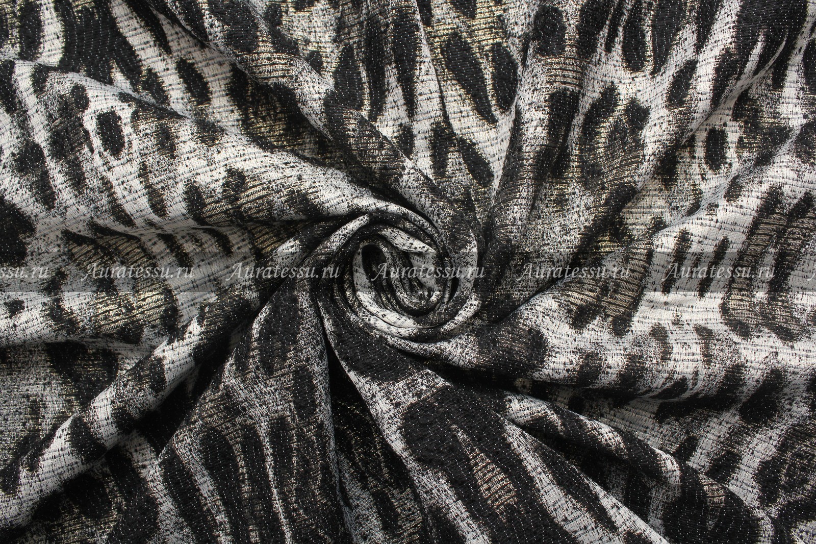 Дополнительная информация:Средней плотности жаккардовое полотно в чёрно-белой гамме с золотым люрексом. Нити утка, чёрного цвета, матовые, буклированные, толстой крутки. Белые нити основы очень тонкие и немного шлифованные. Узор - чёрные пятна леопарда на светлом фоне. Поверхность зернистая, присутствует лёгкий поперечный рубчик. По всему полю воткан золотистый люрекс, не ярко, ткань мерцает. Подходит для пошива костюмной одежды классических силуэтов. Рекомендации по уходуЖаккардовые ткани с составом 100% полиамид: 100% полиамид или полиамид с эластаном (в том числе полиамид более 50%+ ацетат): плательная, костюмная группа. Ткани жаккардовых переплетений, в состав которых входит в основном полиамид с добавлением вискозы, ацетата и эластана можно стирать в машине при температуре до 30°С в щадящем режиме. Можно отжимать в барабане, но всегда лучше на оборотах до 500. Синтетические ткани практически не дают усадку и не мнутся. Для сушки их нужно подвешивать лучше наизнанку. Эти ткани сохнут быстро и иногда не нуждаются в утюжке. Если вы хотите их отутюжить, то делайте это с изнаночной стороны с паром. Гладить на "шелке", можно слегка сбрызнуть. Жаккарды, с шёлковыми волокнами: Рекомендации производителя - профессиональная химчистка. При таком составе, мы тоже не рекомендуем стирать ткань, но вы можете попробовать на кусочке, оставшемся от кроя: ручная стирка, вода до 30°С, не замачивать, мягкие моющие средства для шёлка, стирать только загрязненные места, отжим в полотенце, сушка в горизонтальном расправленном виде изнанкой вверх, гладить на шелке. Вкусочек побольше, чтобы было видно, как поведёт себя ткань.