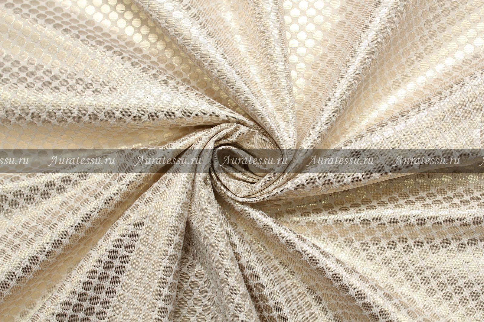 Дополнительная информация:Мягкий и пластичный жаккард-парча молочно-белого цвета с золотистым люрексом. Люрекс приглушённого золотого цвета, очень мягкий и не колючий. Узор в виде мелких и частых горошин диаметром примерно 6 мм., расположенных диагонально. Полотно держит форму, мало сминается. Подходит для пошива нарядных платьев, юбок, блузонов, жакетов прямых, объёмных силуэтов. Отлично будет выглядеть в мягких защипах и бантовых складках, так же можно использовать для разного рода отделок и украшений. Рекомендации по уходуЖаккардовые ткани с составом 100% полиамид: 100% полиамид или полиамид с эластаном (в том числе полиамид более 50%+ ацетат): плательная, костюмная группа. Ткани жаккардовых переплетений, в состав которых входит в основном полиамид с добавлением вискозы, ацетата и эластана можно стирать в машине при температуре до 30°С в щадящем режиме. Можно отжимать в барабане, но всегда лучше на оборотах до 500. Синтетические ткани практически не дают усадку и не мнутся. Для сушки их нужно подвешивать лучше наизнанку. Эти ткани сохнут быстро и иногда не нуждаются в утюжке. Если вы хотите их отутюжить, то делайте это с изнаночной стороны с паром. Гладить на "шелке", можно слегка сбрызнуть. Жаккарды, с шёлковыми волокнами: Рекомендации производителя - профессиональная химчистка. При таком составе, мы тоже не рекомендуем стирать ткань, но вы можете попробовать на кусочке, оставшемся от кроя: ручная стирка, вода до 30°С, не замачивать, мягкие моющие средства для шёлка, стирать только загрязненные места, отжим в полотенце, сушка в горизонтальном расправленном виде изнанкой вверх, гладить на шелке. Вкусочек побольше, чтобы было видно, как поведёт себя ткань.