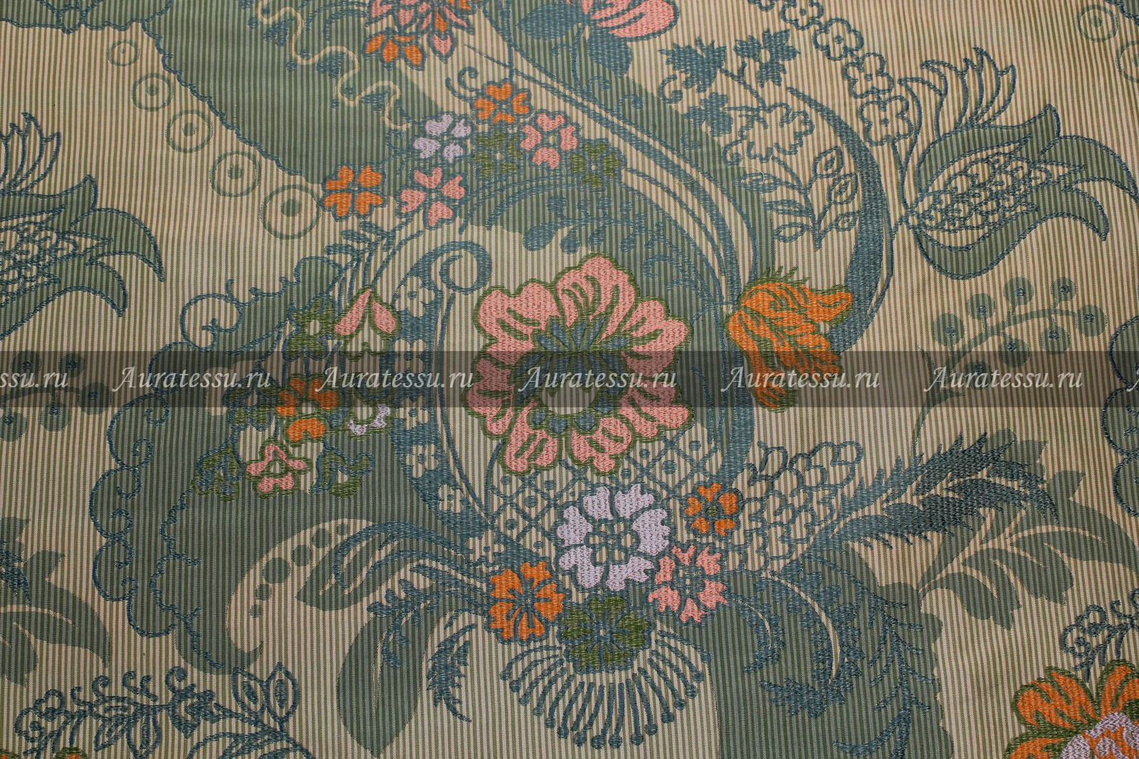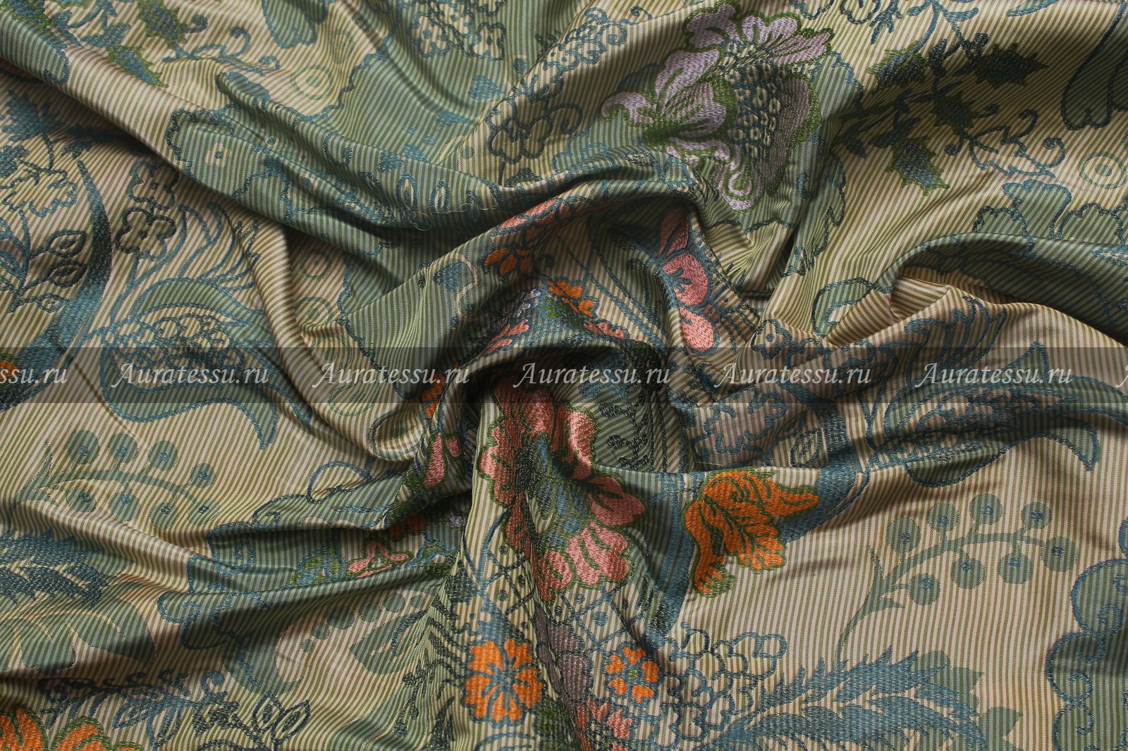 Дополнительная информация:Плотная жаккардовая ткань, в оливковых тонах с растительно-цветочным узором. Ткань упругая, держит форму, но не жёсткая, по свойствам напоминает тафту. Узор похож на вышитый с глянцевым лоском. Основной фон т тонкую продольную полоску оливкового и горчичного оттенка. Цветовая гамма рисунка в жёлтом, сиреневом, персиковом цвете. Подходит для пошива нарядной, праздничной одежды прямых, объёмных силуэтов. Рекомендации по уходуЖаккардовые ткани с составом 100% полиамид: 100% полиамид или полиамид с эластаном (в том числе полиамид более 50%+ ацетат): плательная, костюмная группа. Ткани жаккардовых переплетений, в состав которых входит в основном полиамид с добавлением вискозы, ацетата и эластана можно стирать в машине при температуре до 30°С в щадящем режиме. Можно отжимать в барабане, но всегда лучше на оборотах до 500. Синтетические ткани практически не дают усадку и не мнутся. Для сушки их нужно подвешивать лучше наизнанку. Эти ткани сохнут быстро и иногда не нуждаются в утюжке. Если вы хотите их отутюжить, то делайте это с изнаночной стороны с паром. Гладить на "шелке", можно слегка сбрызнуть. Жаккарды, с шёлковыми волокнами: Рекомендации производителя - профессиональная химчистка. При таком составе, мы тоже не рекомендуем стирать ткань, но вы можете попробовать на кусочке, оставшемся от кроя: ручная стирка, вода до 30°С, не замачивать, мягкие моющие средства для шёлка, стирать только загрязненные места, отжим в полотенце, сушка в горизонтальном расправленном виде изнанкой вверх, гладить на шелке. Вкусочек побольше, чтобы было видно, как поведёт себя ткань.