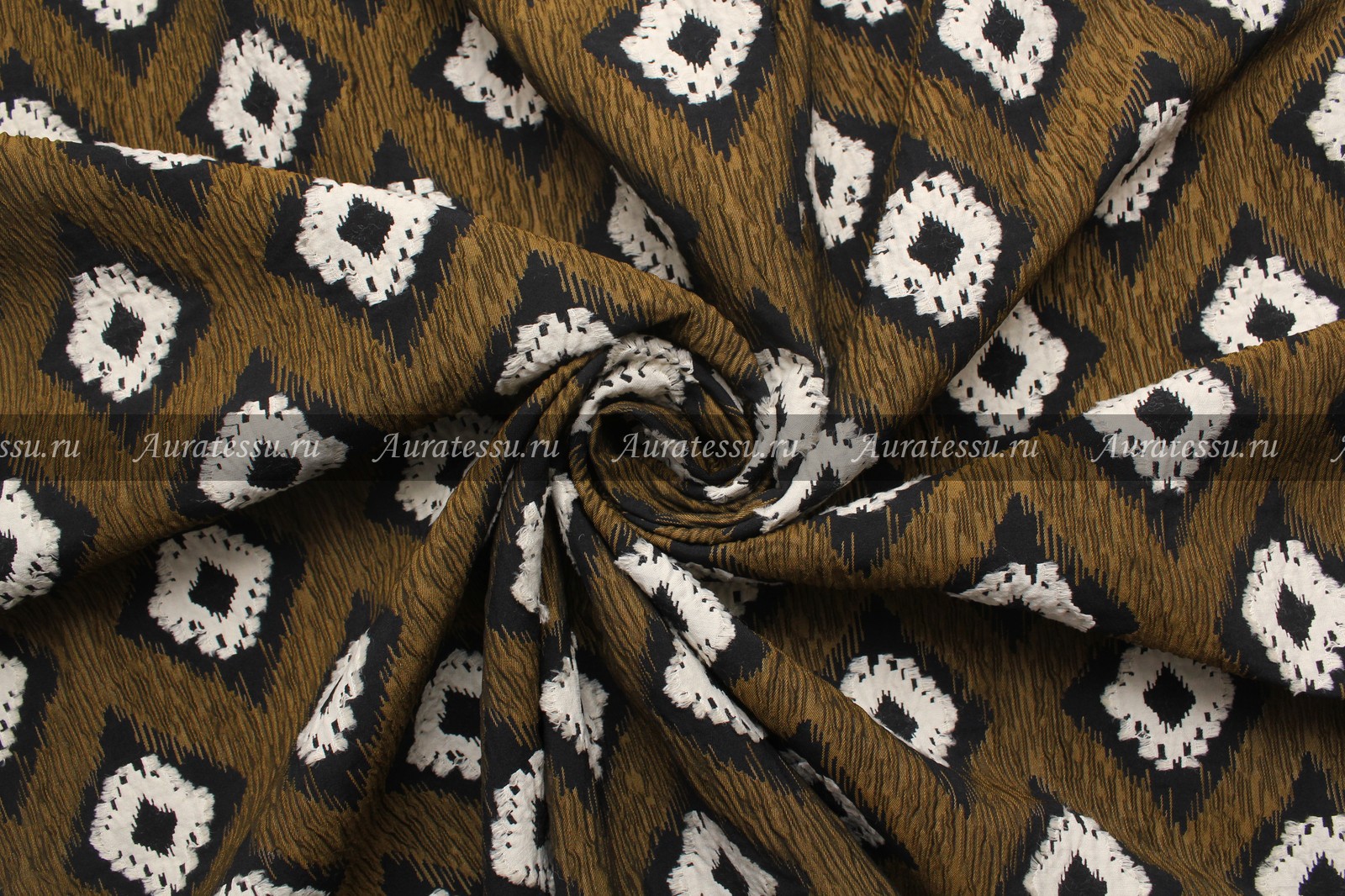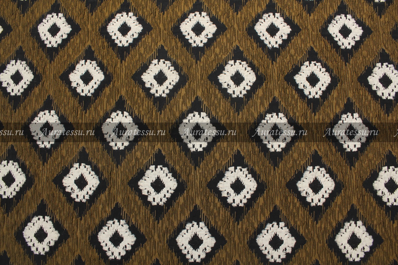 Дополнительная информация:Объёмное жаккардовое полотно в технике клоке с продольным креш сжатием по зелёно-коричневому фону ткани. Полотно средней плотности в узором чёрных ромбов и белых «разлохмаченных» фигурок по центру ромба. Размер ромбов 5x5 см. Основной фон зелёно-коричневого (хаки) цвета. Ткань упругая, держит форму. Подходит для пошива летних пальто, жакетов и юбок прямых, классических силуэтов. Рекомендации по уходуЖаккардовые ткани с составом 100% полиамид: 100% полиамид или полиамид с эластаном (в том числе полиамид более 50%+ ацетат): плательная, костюмная группа. Ткани жаккардовых переплетений, в состав которых входит в основном полиамид с добавлением вискозы, ацетата и эластана можно стирать в машине при температуре до 30°С в щадящем режиме. Можно отжимать в барабане, но всегда лучше на оборотах до 500. Синтетические ткани практически не дают усадку и не мнутся. Для сушки их нужно подвешивать лучше наизнанку. Эти ткани сохнут быстро и иногда не нуждаются в утюжке. Если вы хотите их отутюжить, то делайте это с изнаночной стороны с паром. Гладить на "шелке", можно слегка сбрызнуть. Жаккарды, с шёлковыми волокнами: Рекомендации производителя - профессиональная химчистка. При таком составе, мы тоже не рекомендуем стирать ткань, но вы можете попробовать на кусочке, оставшемся от кроя: ручная стирка, вода до 30°С, не замачивать, мягкие моющие средства для шёлка, стирать только загрязненные места, отжим в полотенце, сушка в горизонтальном расправленном виде изнанкой вверх, гладить на шелке. Вкусочек побольше, чтобы было видно, как поведёт себя ткань.
