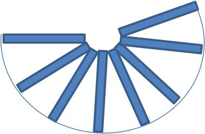 2) Разрезаете свой прямоугольник на 4 равные части. И разводите их по нижнему краю, к примеру, на 10 см. Эта цифру я придумала для примера, она может быть любой. 3) Обведите полученную выкройку по контуру, чтобы скруглить получившиеся углы. И перенесите на ткань. Таких деталей вам понадобится 2 экземпляра - перед и зад. По этой схеме можно выкроить любую пышность юбки, не только "полусолнце", но и полное "солнце" и "полтора солнца" и даже "два солнца". Просто нужно будет наш первый прямоугольник разезать на большее количесто частей, например на 8, а потом развести на необходимое расстояние. Примерно так будет выглядеть выкройка юбки "полтора солнца":