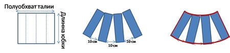 1) Измеряете сантиметром обхват талии. Например 46см. Делите это число на 2. Получается 23см - это и есть полуобхват талии. Рисуете прямоугольник, одна сторона которого равна полуобхвату талии, т.е. 23 см, а другая длинне юбки.