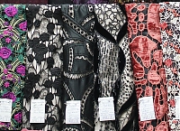 джинсовые ткани однотонные, джинс с рисунком или вышивкой , вельвет, лен, хлопок, однотонные синетические, вискозные атласные ткани, или атласы с рисунком, сетчатые ткани, фатин, плательные ткани из вискозы, вискозные жоржеты, искусственные кожа и замша, однотонная и с рисунком. Большой фотокаталог искусственного меха в полном ассортименте и отсортированного по группам коротковорсный, длинноворсный, под норку, со средней длиной ворса, искусственный мех белого цвета- для шитья одежды и ее отделки, плащево-курточные ткани, водонепроницаемые, стеганые на синтепоне, различные виды синтепонов, утеплителей, подкладочные ткани, платки и палантины, накладки на лифы для изготовления платьев.